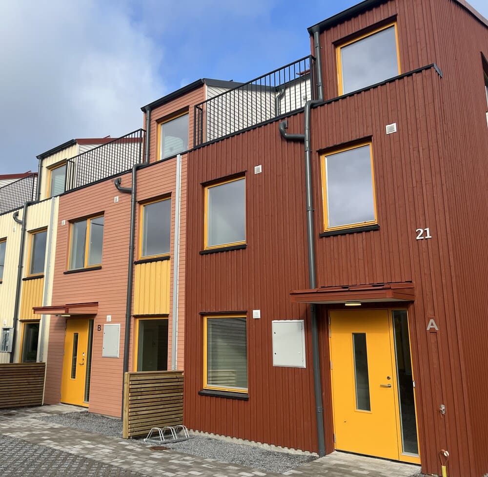 De fargerike rekkehusene som vi presenterer, er bygget av våre prefabrikkerte elementer. Boligområdet er typisk for den svenske byggestilen. Veggenes konstruksjon er tilpasset lokale standarder og krav.